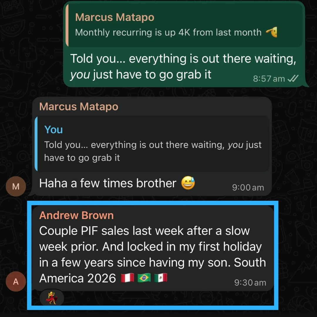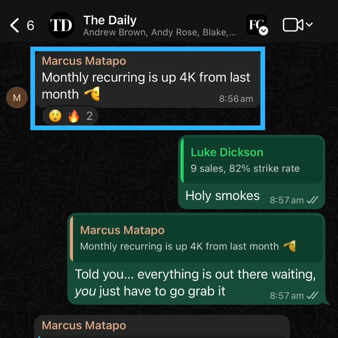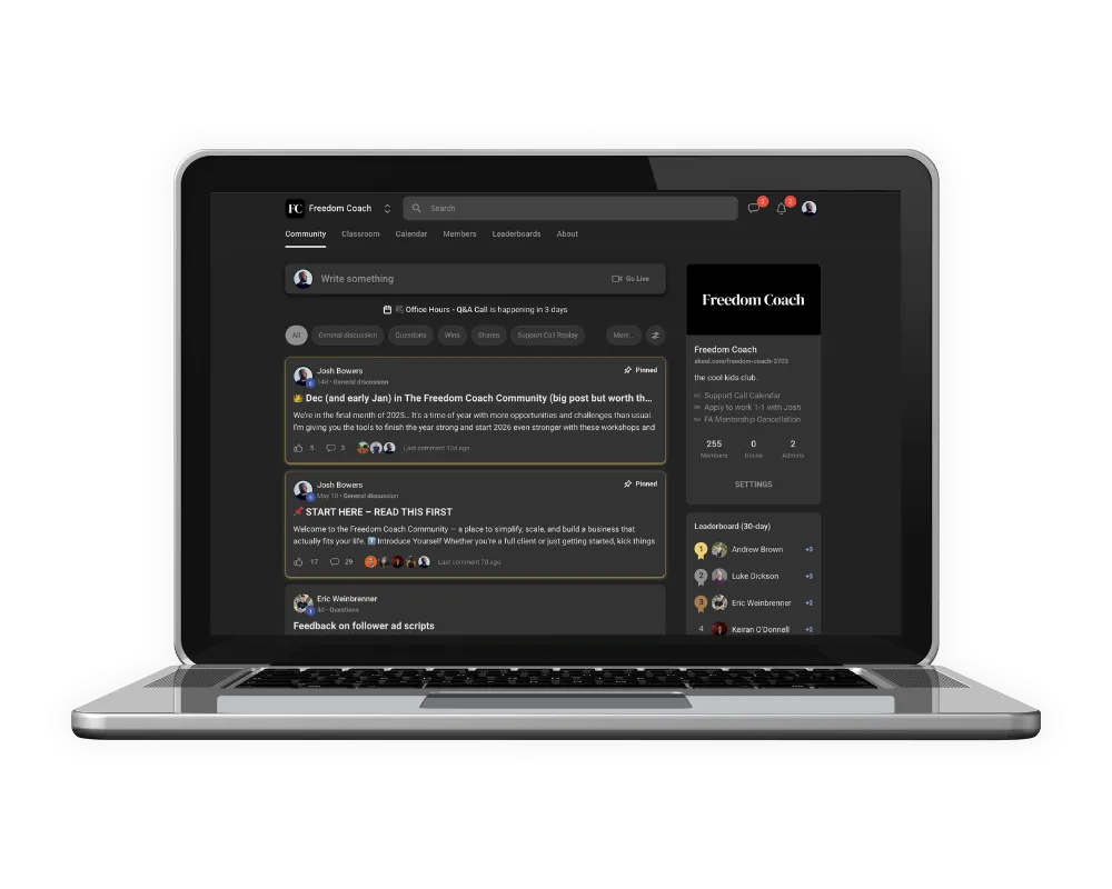 We get together twice a week and review your ads, content, DMs, and any bottleneck holding you back. Bring your questions, get real-time fixes, and watch other coaches solve problems you didn't know you had.