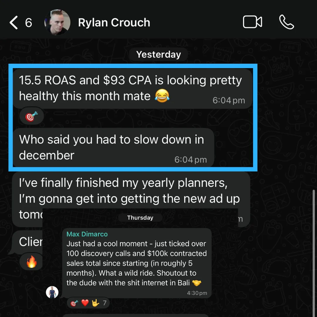 Got a question? Need feedback on your ads? You have direct access to Josh (not a support coach or VA) via private WhatsApp, so you're never stuck waiting in endless Slack thread.