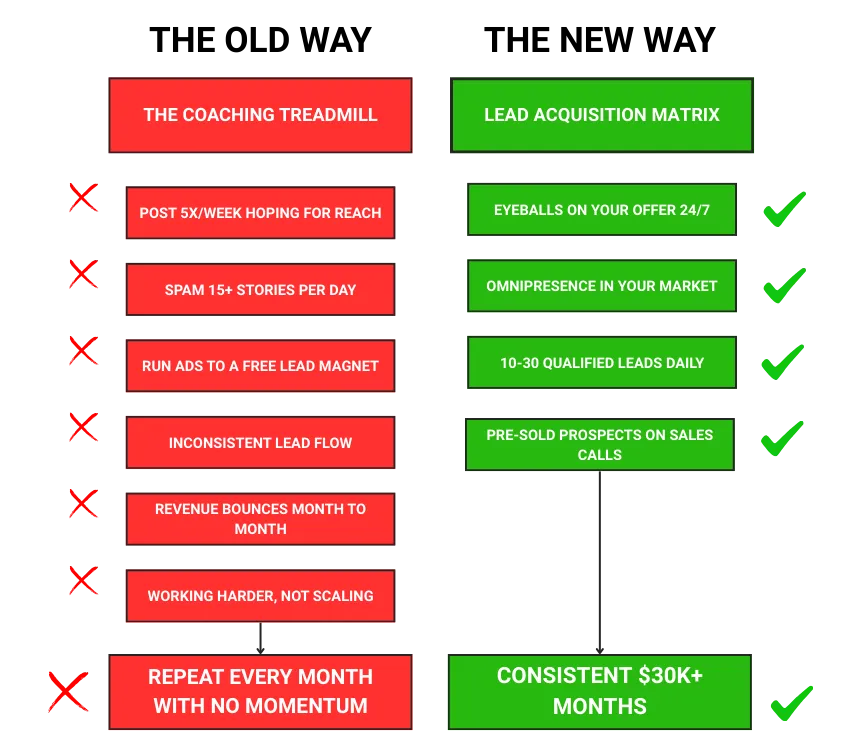 The Lead Acquisition Matrix is the system that takes your online fitness coaching business from inconsistent $5-15K months to consistent $30K+ months.